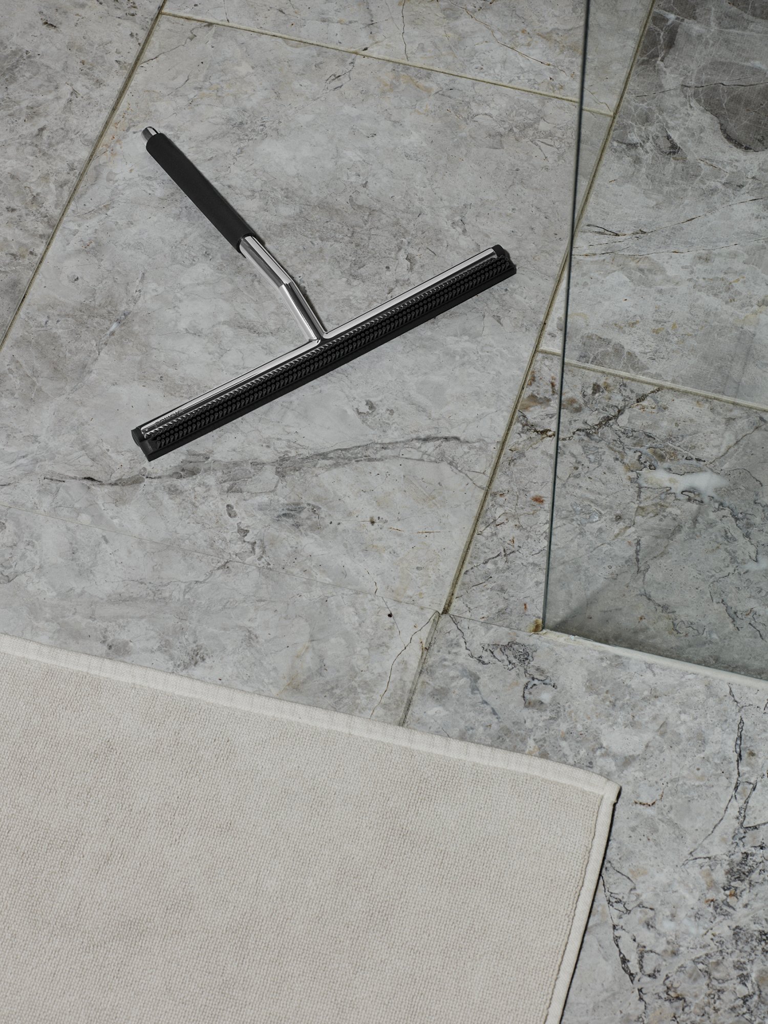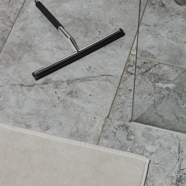 Eleganter Bodenwischer auf einem Marmorkachelfboden neben einem strukturierten Teppich.