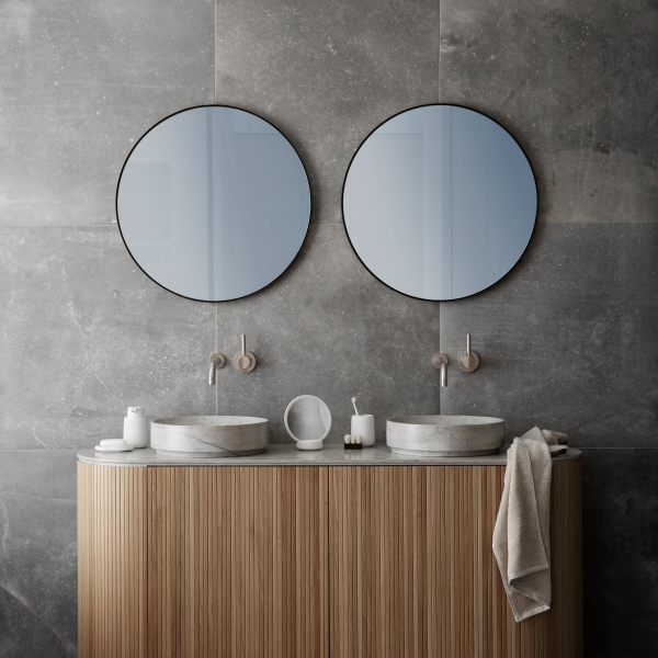 Moderne Badezimmergestaltung mit doppelten runden Spiegeln über einem Holzwaschtisch mit Waschbecken.