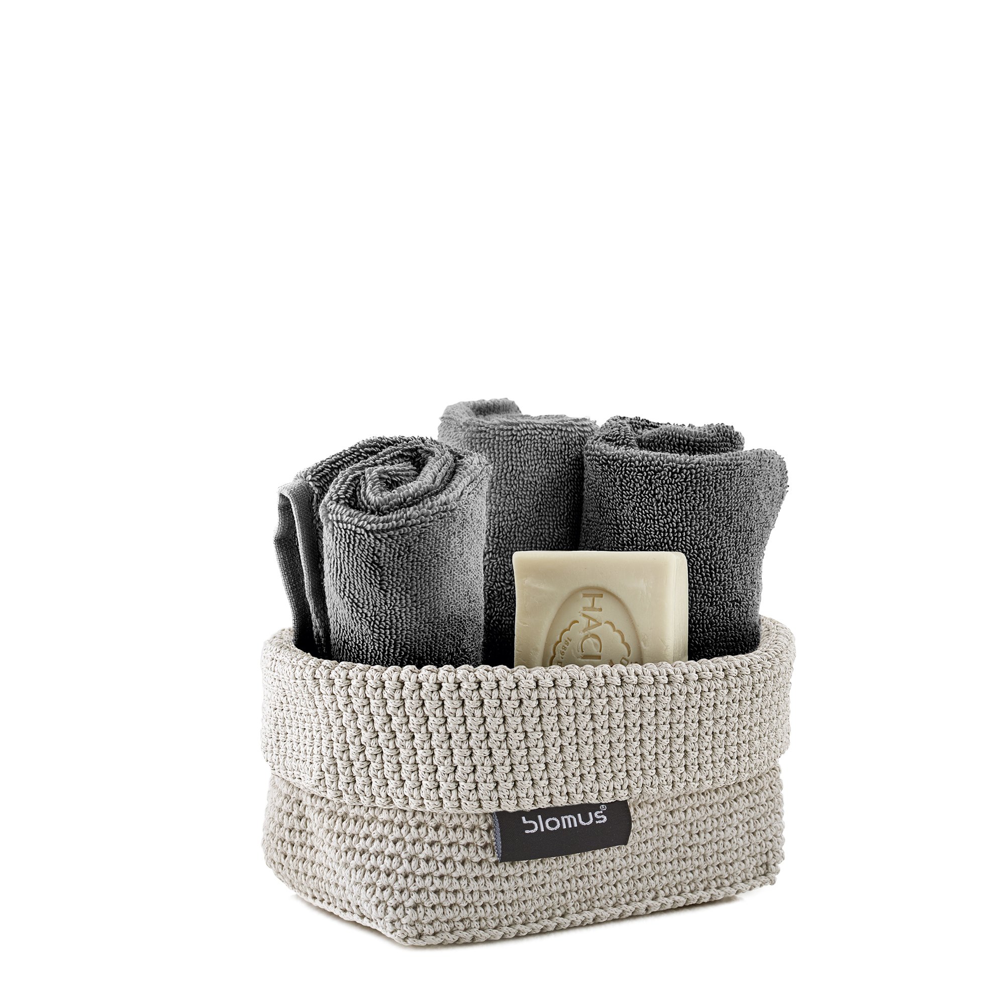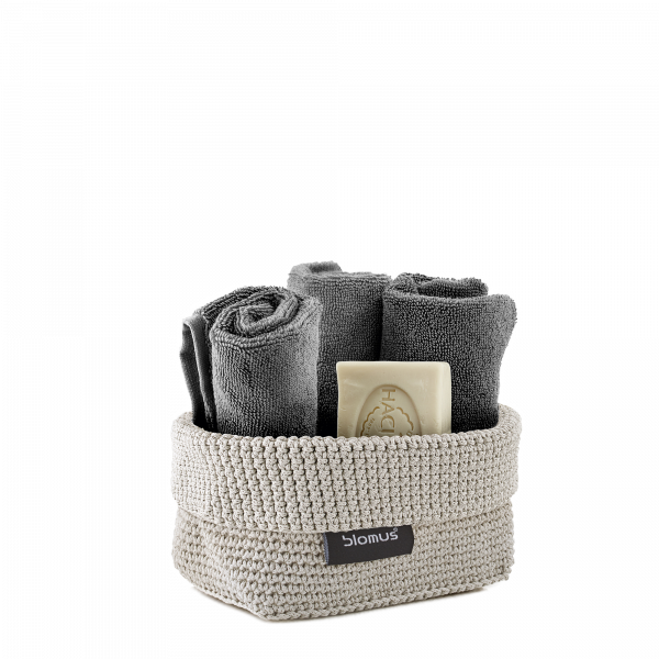 Neatly arranged gray towels and soap in a stylish woven basket.