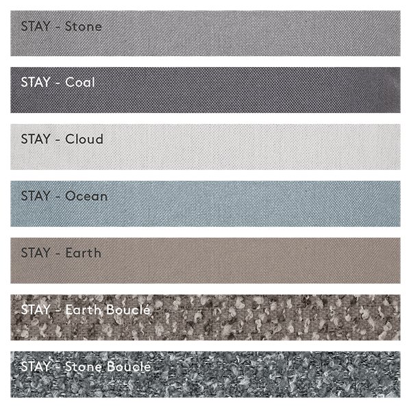 Stoffmuster in verschiedenen Farben mit den Bezeichnungen Stein, Kohle, Wolke, Ozean, Erde und Erdboucle.