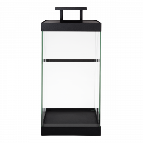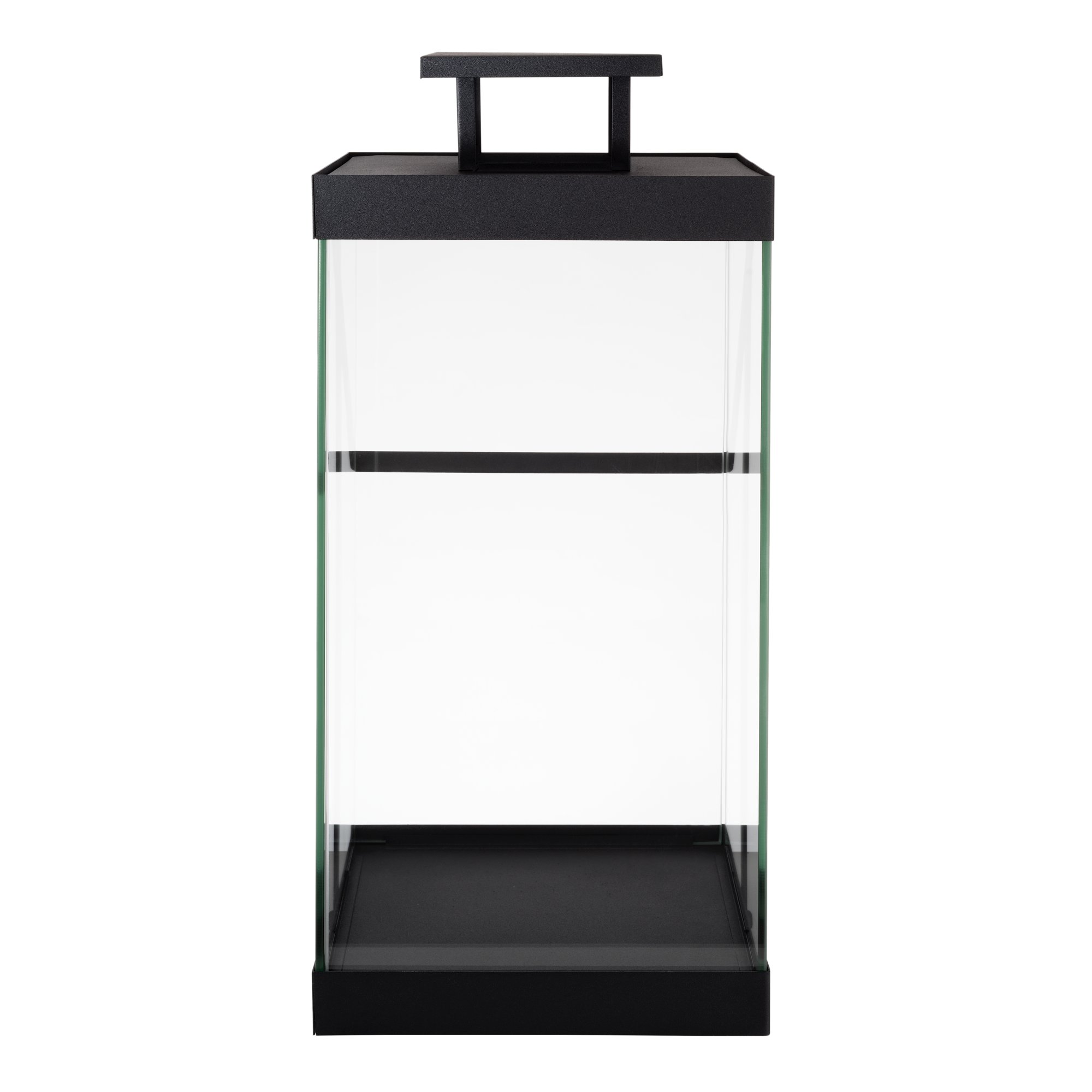 Elegante schwarze Laterne mit Glasplatten, perfekt für die Dekoration im Freien und drinnen.