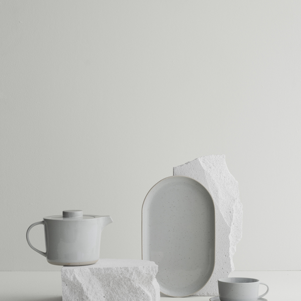 Elegantes weißes Teeset mit strukturierten Steinelementen vor einem minimalistischen Hintergrund.