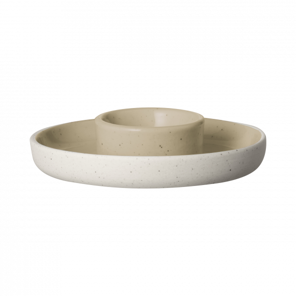 Elegantes beiges Keramik-Serviertablett mit einer zentralen Schüssel für Appetithäppchen.