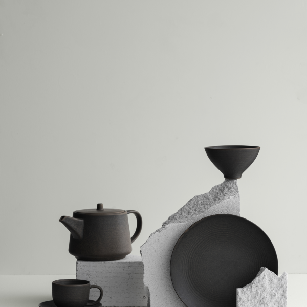 Moderne schwarze Keramik, präsentiert mit strukturierten Steinelementen vor einem minimalistischen Hintergrund.