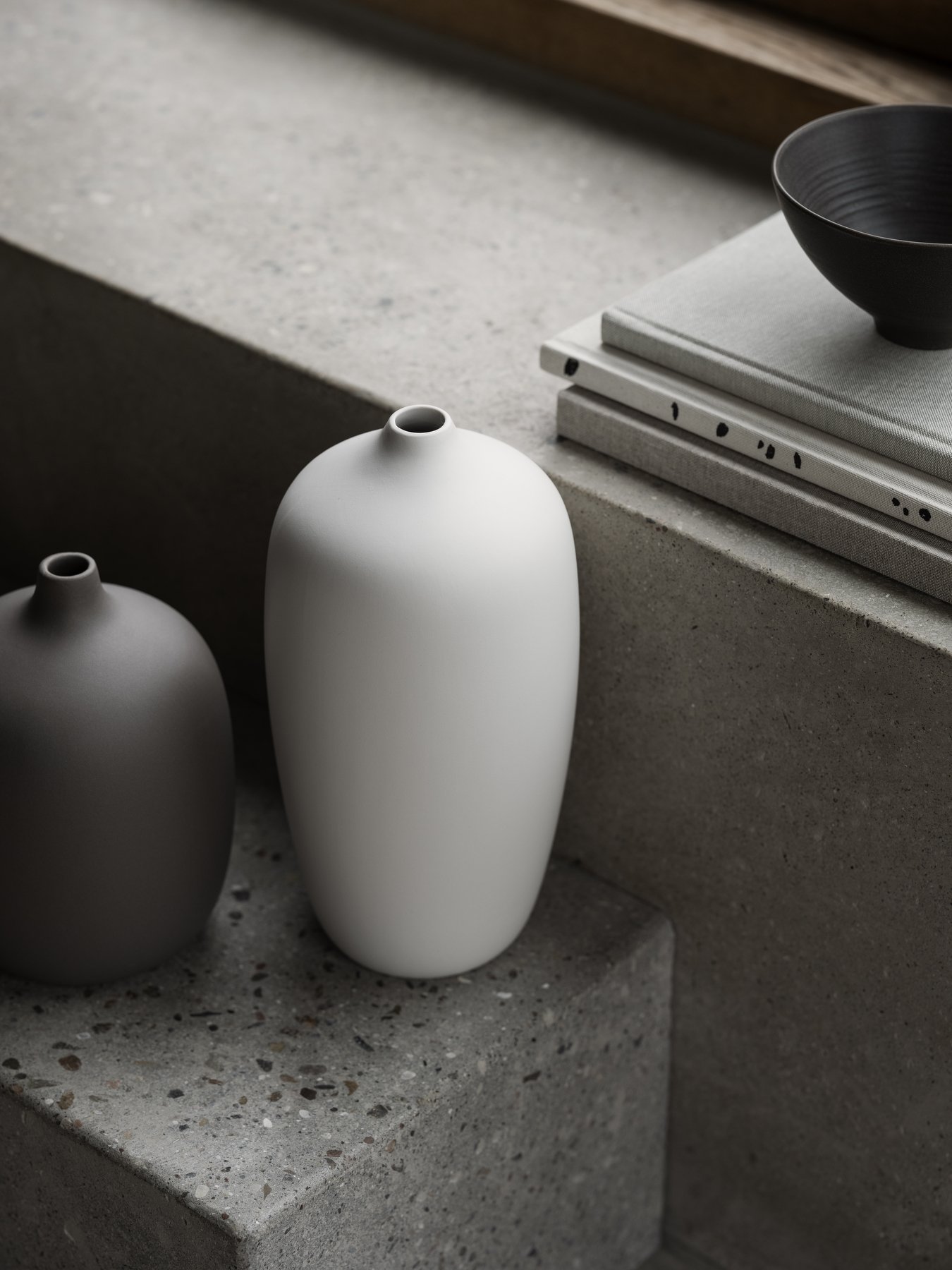Die Vasen der Serie CEOLA sind matt, haben eine rau glasierte Oberfläche und sind aus widerstandsfähiger Keramik hergestellt. Kleine Unebenheiten, leichte Farbabweichungen und sichtbare Linien sind Fertigungsspuren, die auf die Herstellung verweisen. Sie machen diese Vasen zu einem Unikat.