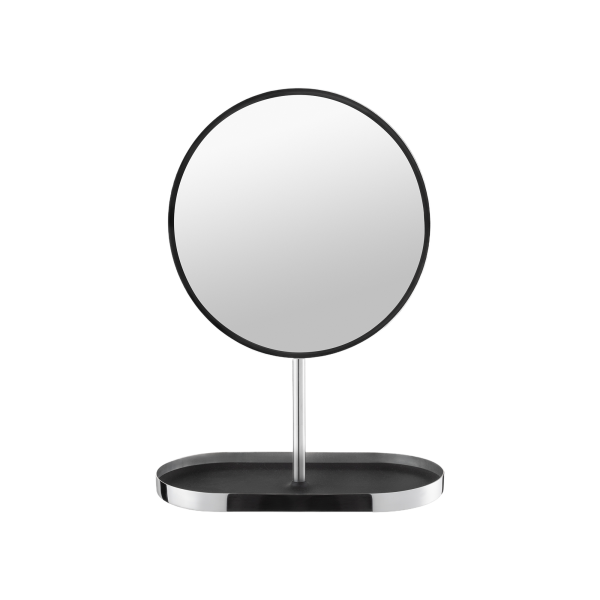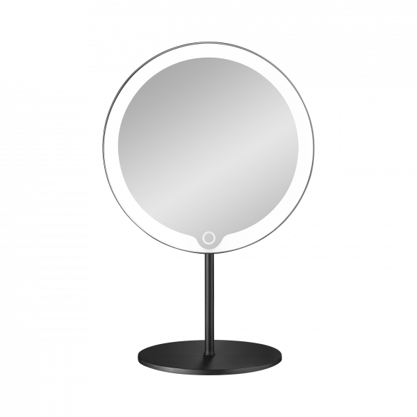 Modern runder beleuchteter Schminkspiegel auf einem eleganten Ständer mit minimalistischer Gestaltung.
