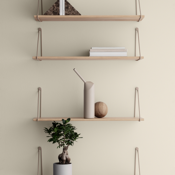 Moderne minimalistische Regale mit dekorativen Gegenständen und einer Topfpflanze vor einer sanften Wand.