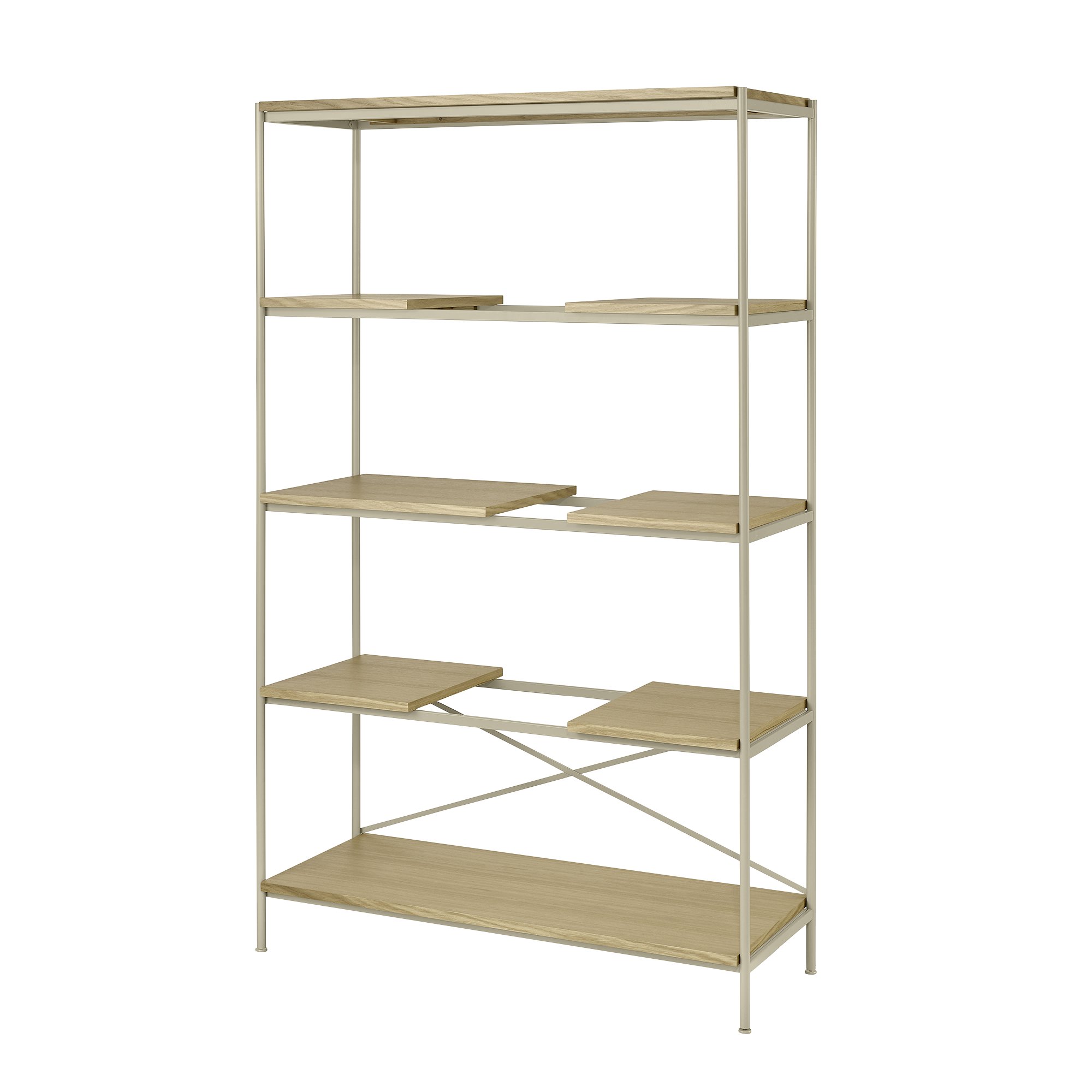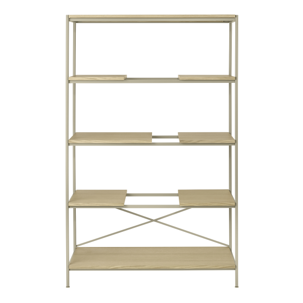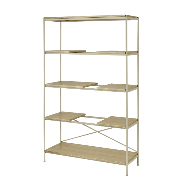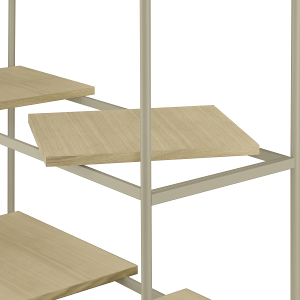 SUKOYA ist in zwei Versionen erhältlich. Die Holzversion ist aus einem Eichenrahmen und Holzbrettern aus Eichenfurnier gefertigt. Die Metallversion besteht aus pulverbeschichtetem Stahl mit Regalböden aus Eichenfurnier.