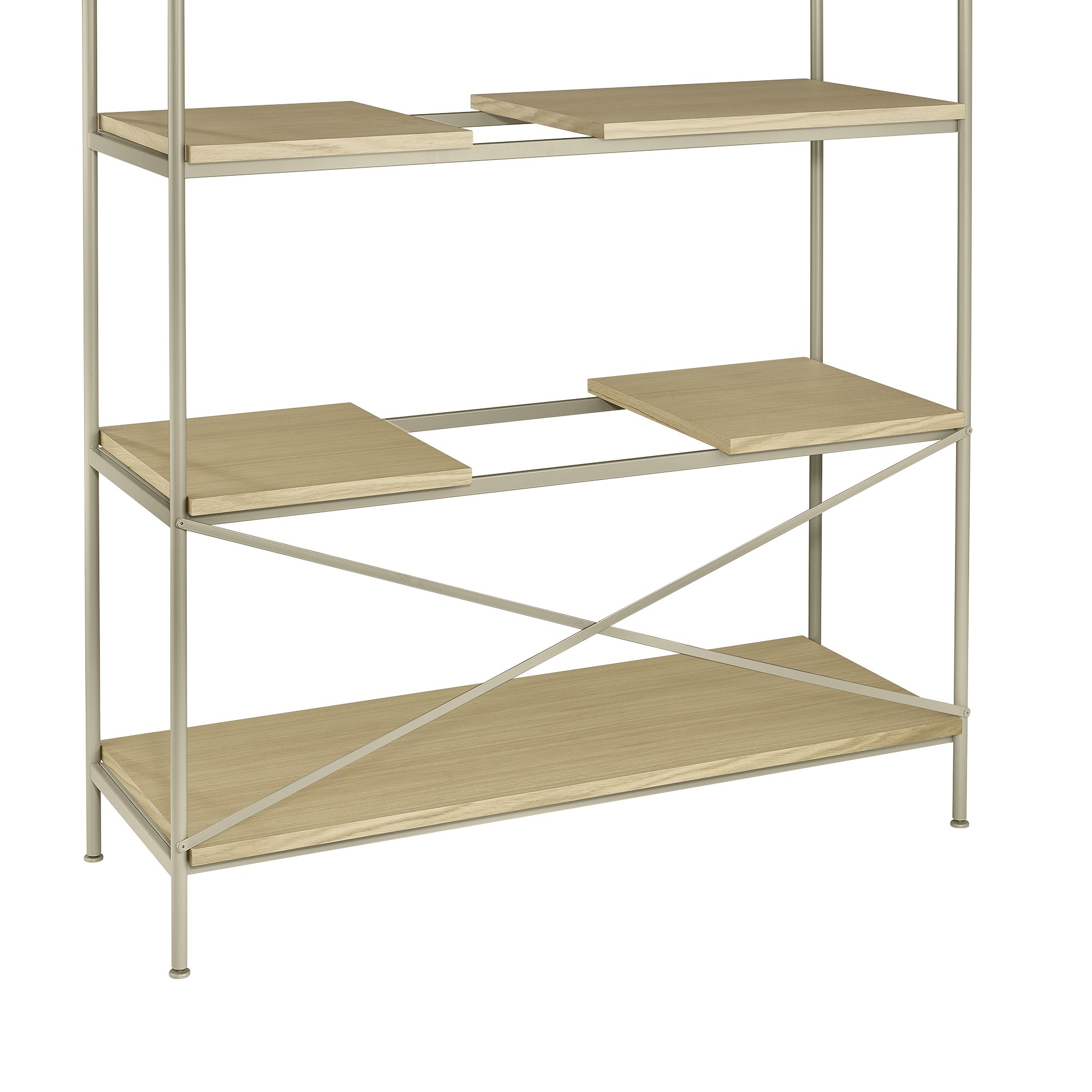 Die Regalbretter sind so konzipiert, dass sie frei auf dem fest positionierten horizontalen Regalrahmen verschoben werden können.