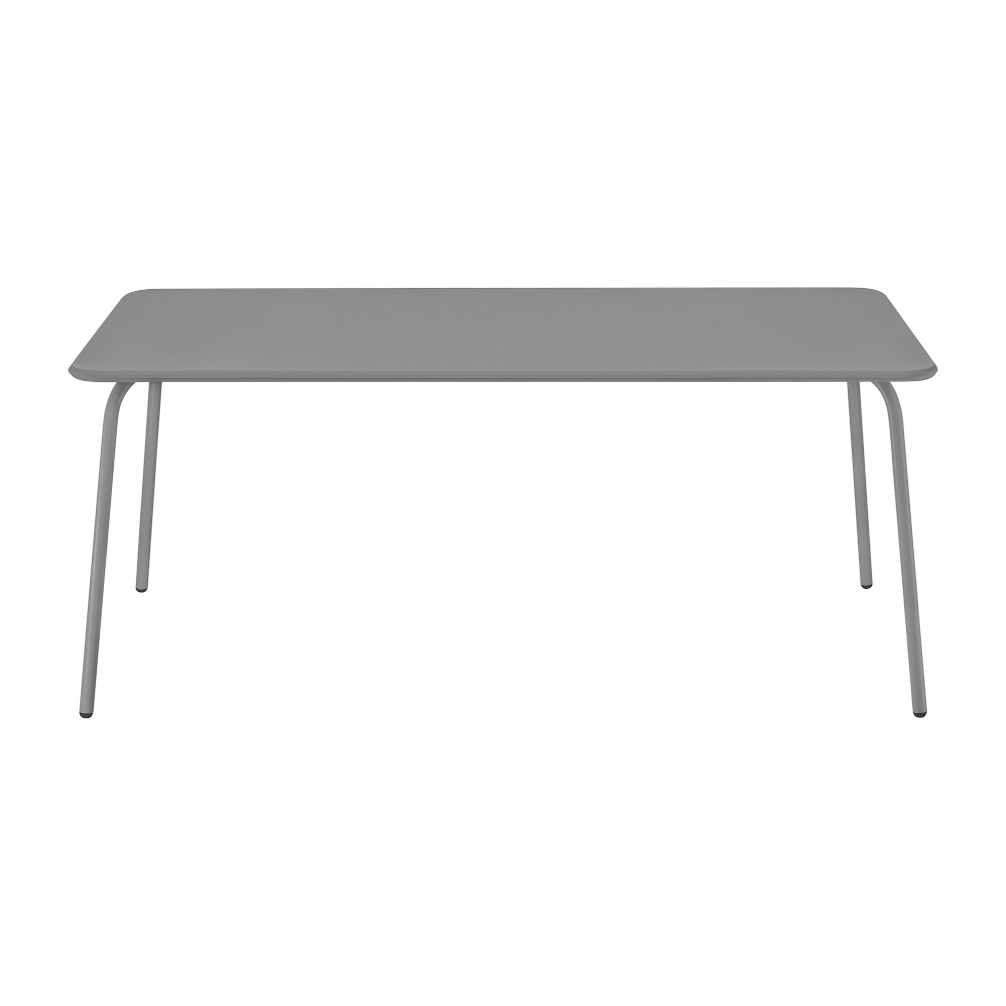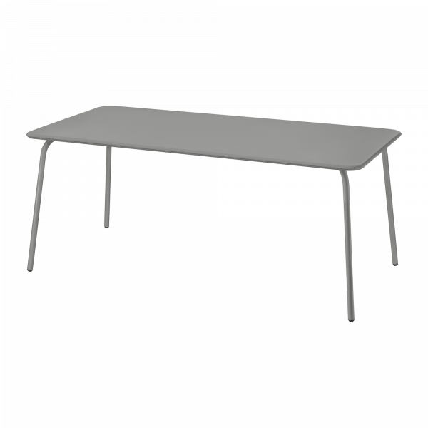 Modern gray rectangular table with sleek legs, ideal for dining or workspace.
