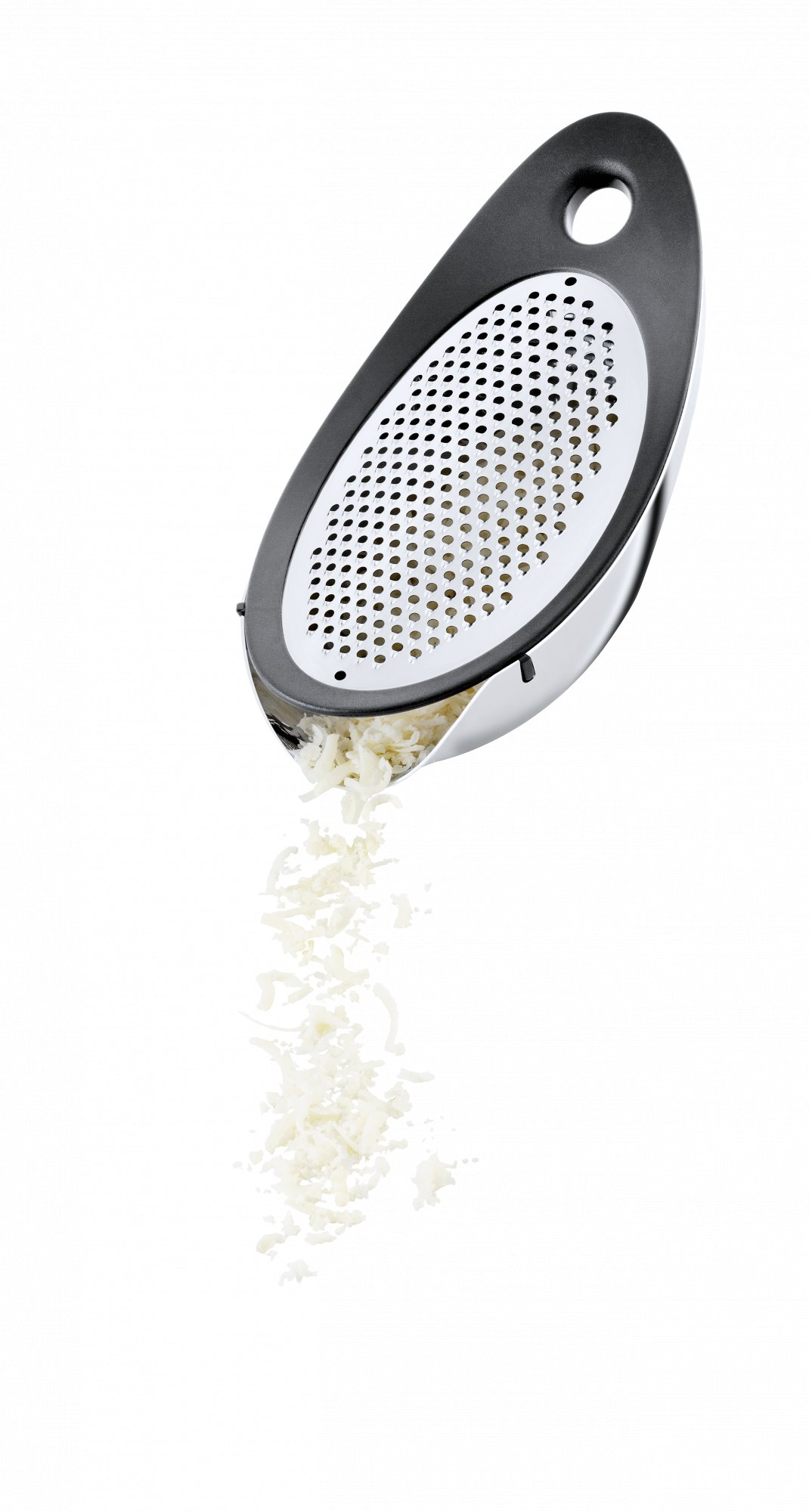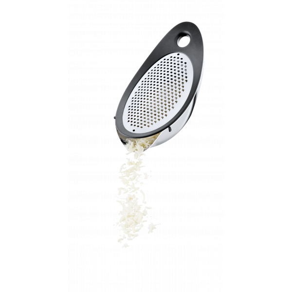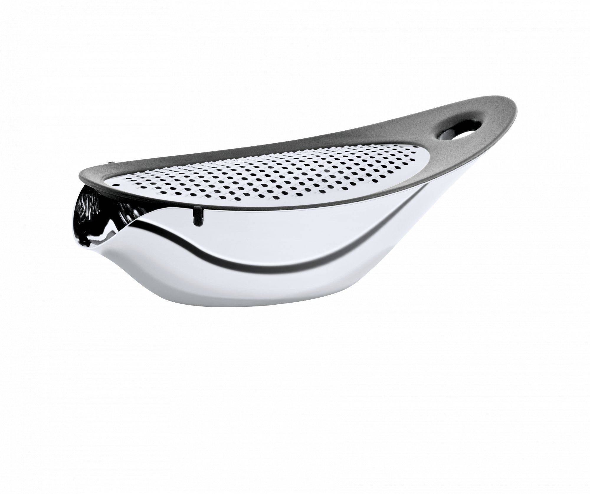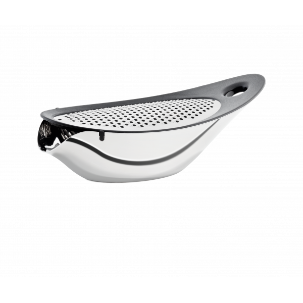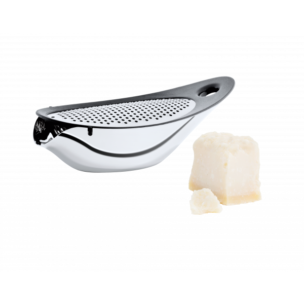 The stainless steel grater is encased in plastic, and fits into a shaped tray. Thanks to its comfortable polished stainless steel shape, the Cheese Grater can be easily held steady in the hand, or positioned on the work surface.