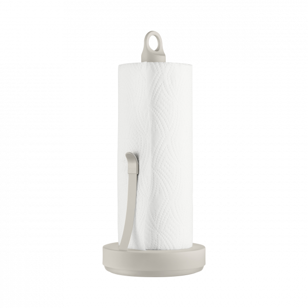 White paper towel roll on a stylish gray holder for kitchen organization.