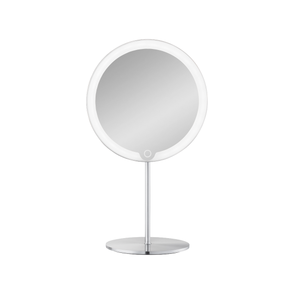 Modern round vanity mirror with LED lighting on a sleek stand.