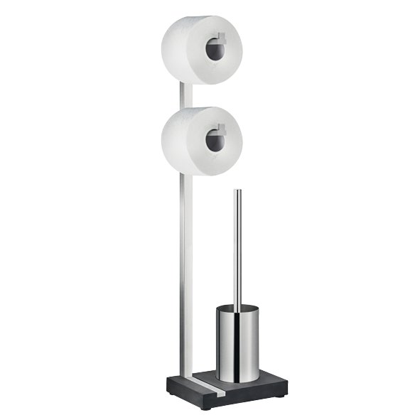 Modern bathroom accessory set featuring a double toilet paper stand and a toilet brush holder.