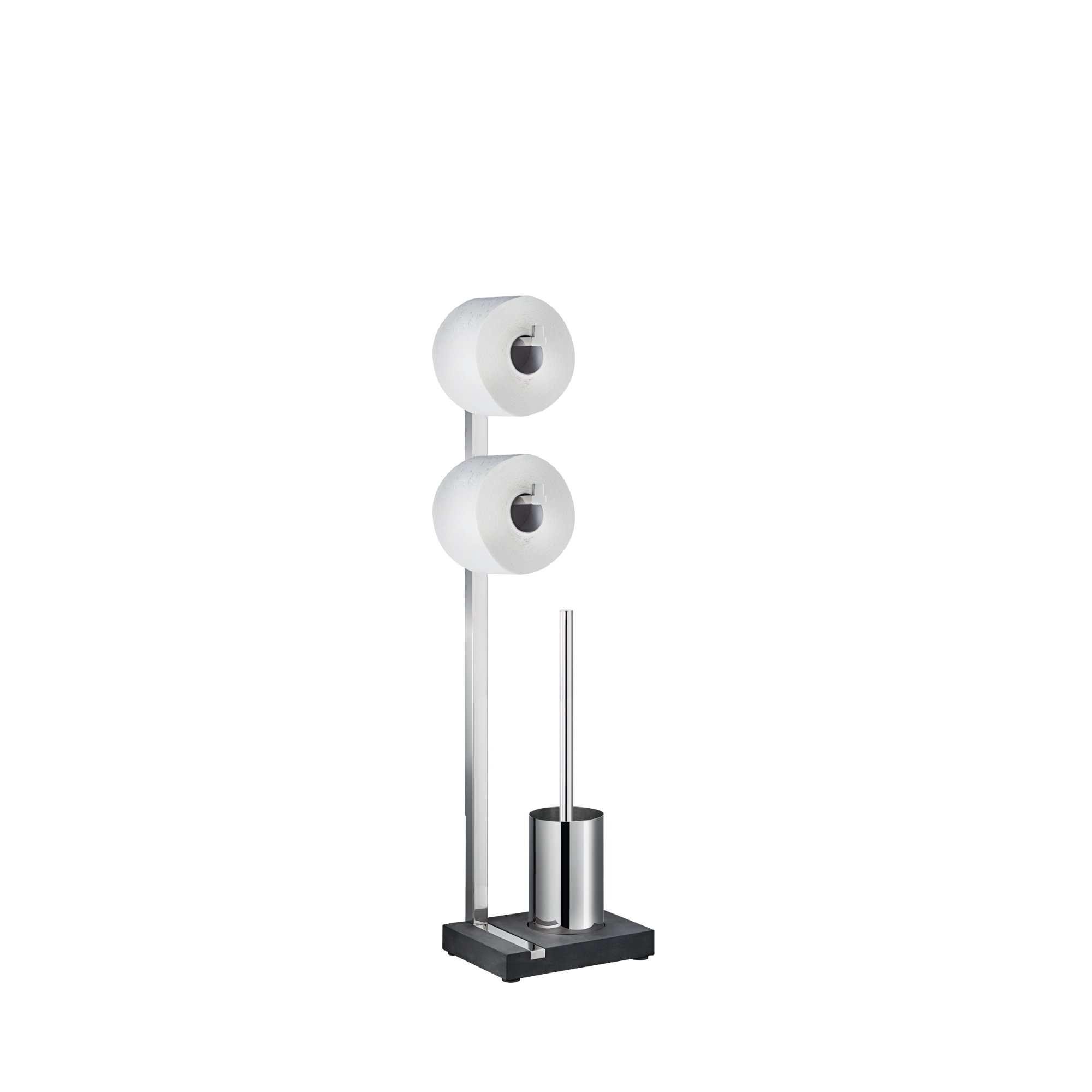 Modern toilet paper holder and brush set in sleek silver design on black base.