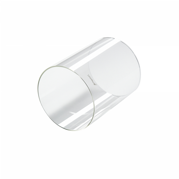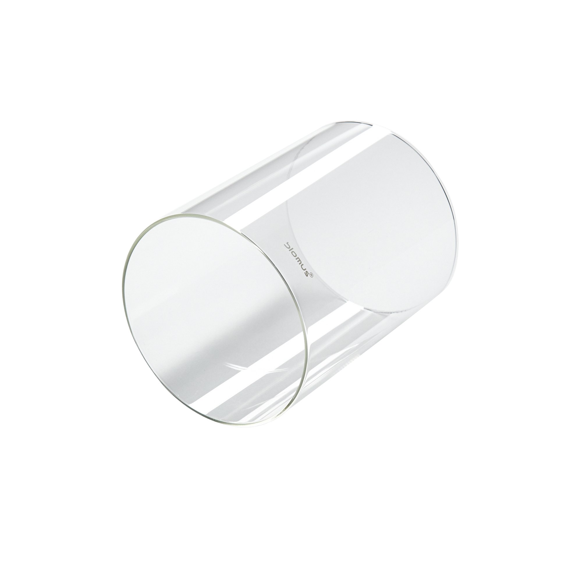 Clear cylindrical glass container on a white background.