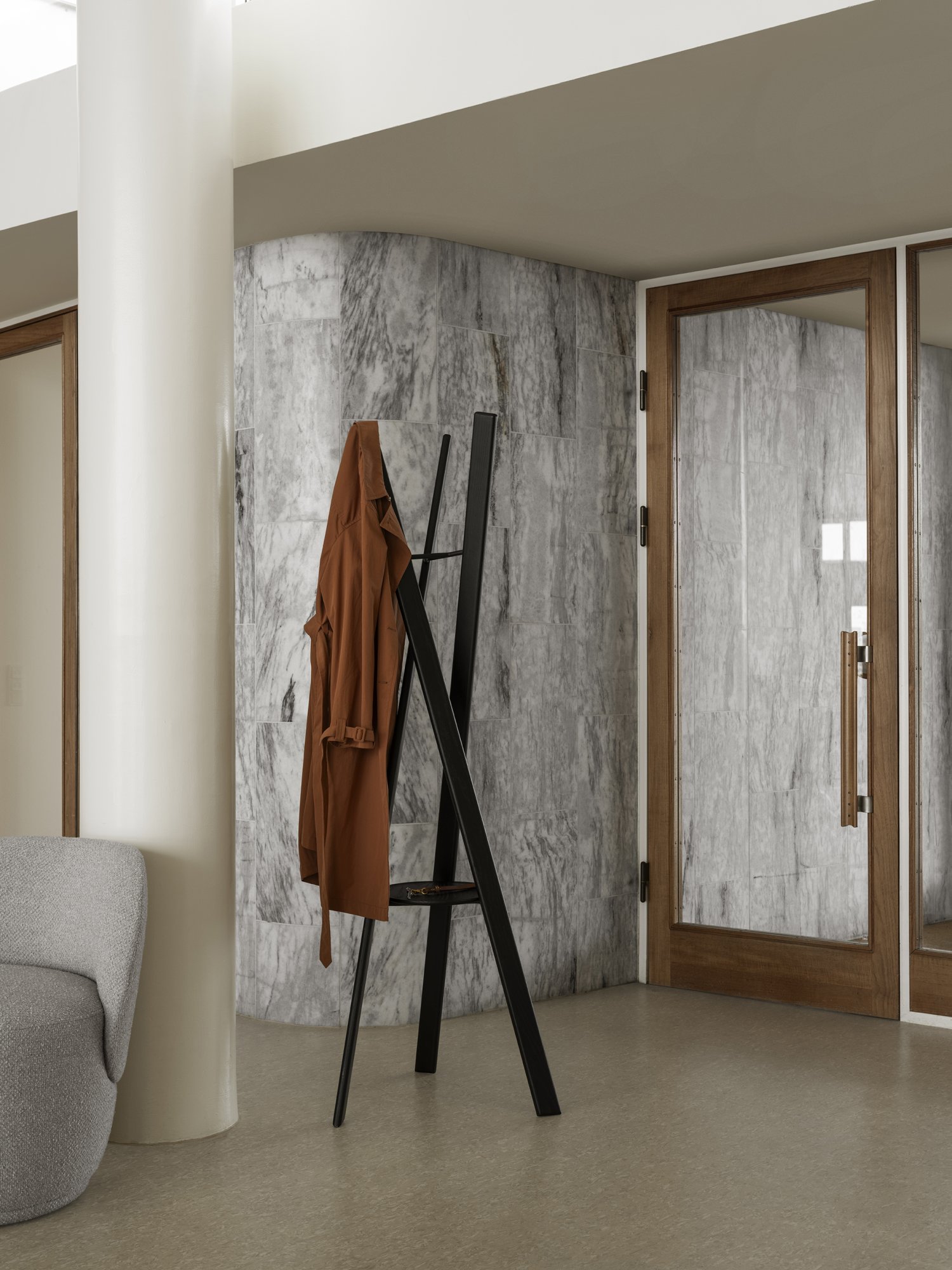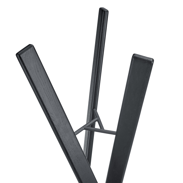 The RAKKU coat stand is available in natural or black stained oak and is delivered fully assembled.
