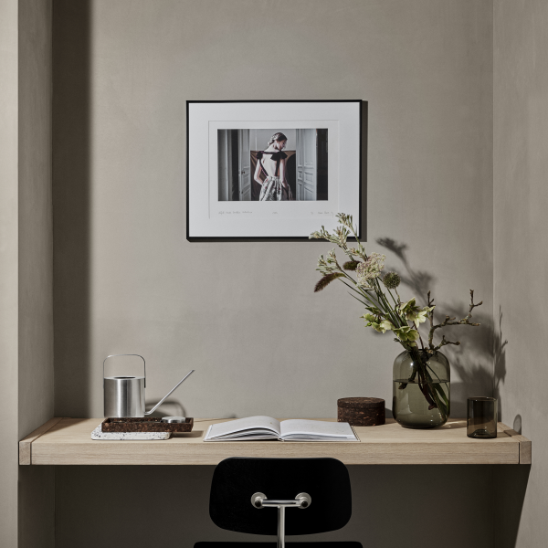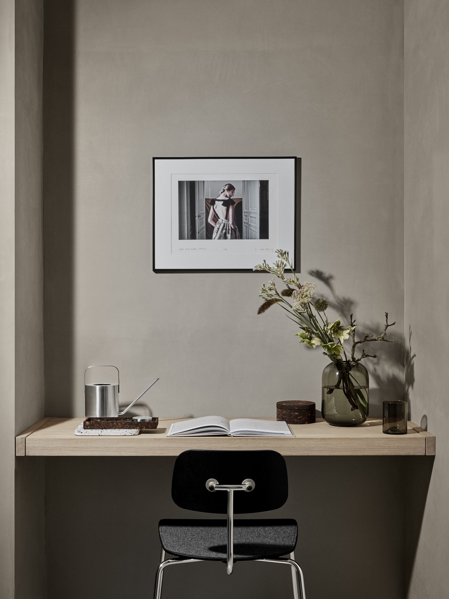 Minimalistischer Arbeitsplatz mit einem Holztisch, gerahmter Kunst und frischen Blumen in einer Vase.