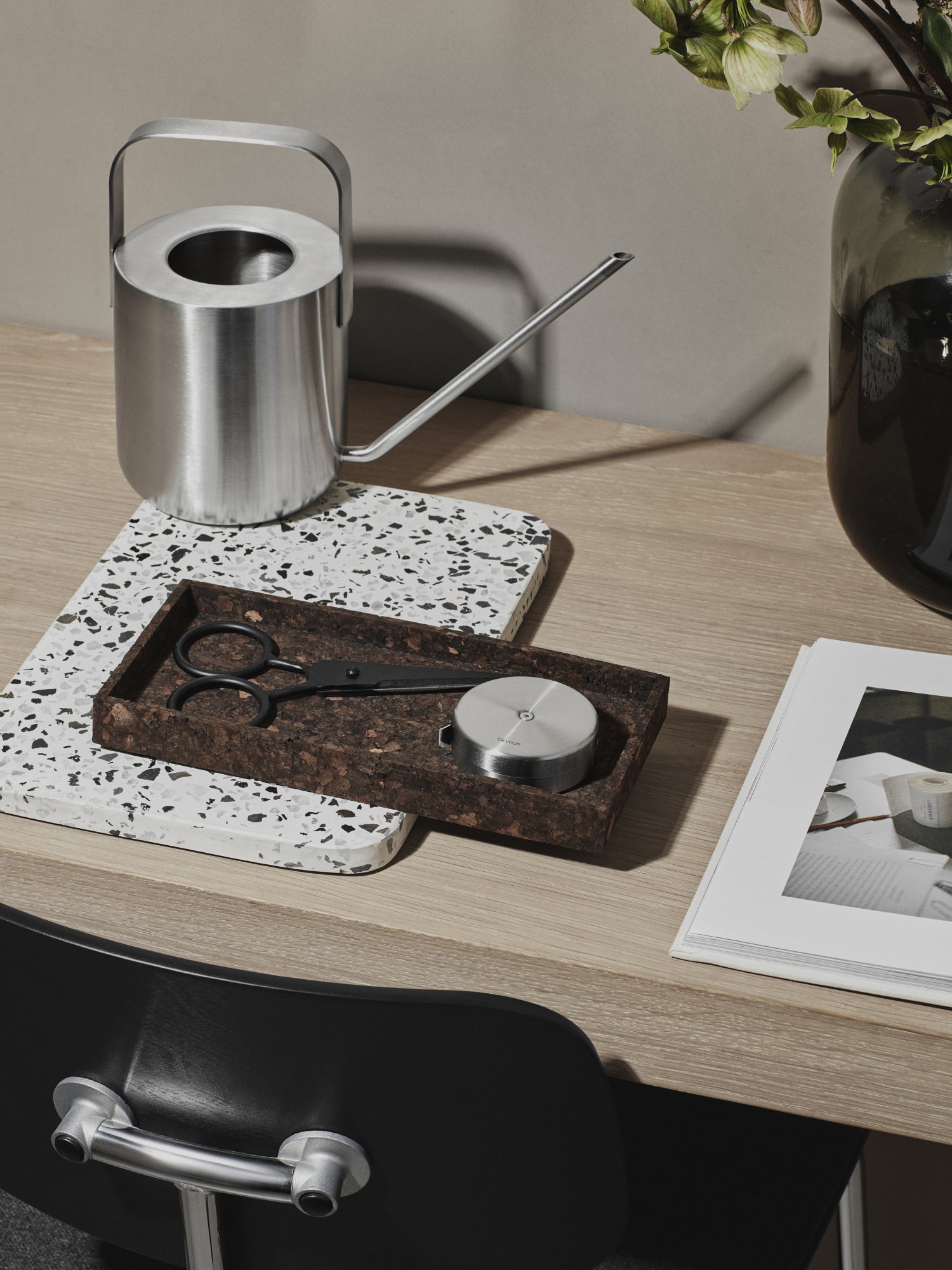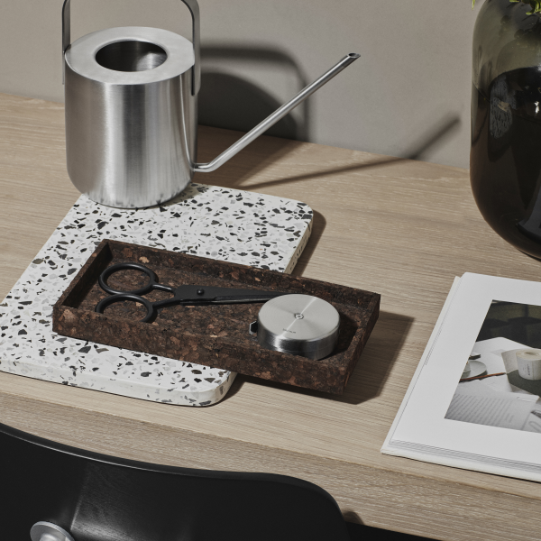 Stilvolles Schreibtisch-Setup mit dekorativen Scheren, einer Metalldose und einem Terrazzo-Tablett.