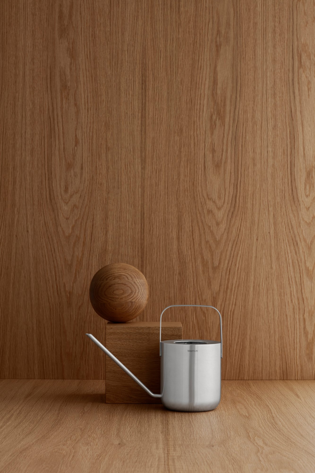 Minimalistische Holzausstattung mit einer Kugel und einem silbernen Behälter auf einer Holzoberfläche.