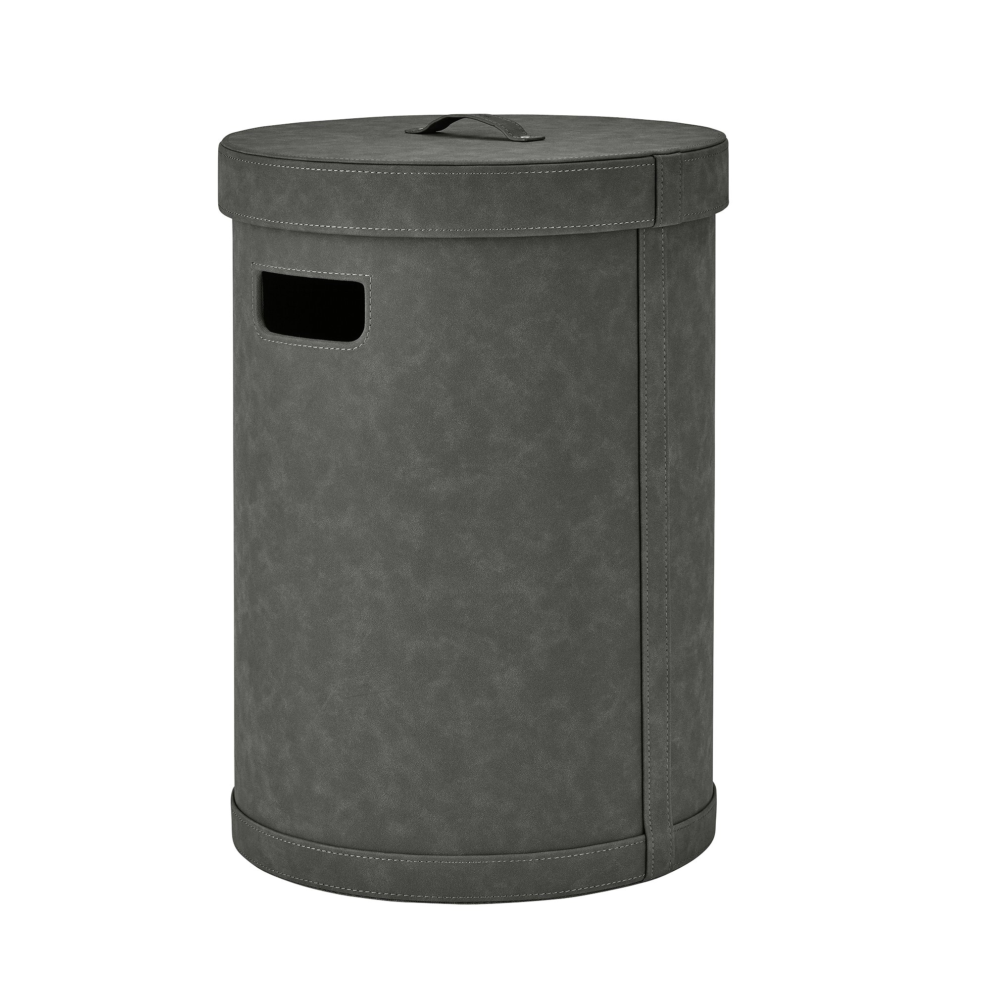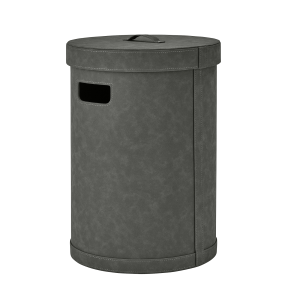 Stylische runde graue Aufbewahrungsbox mit einem Deckel und Griffen zum einfachen Tragen.